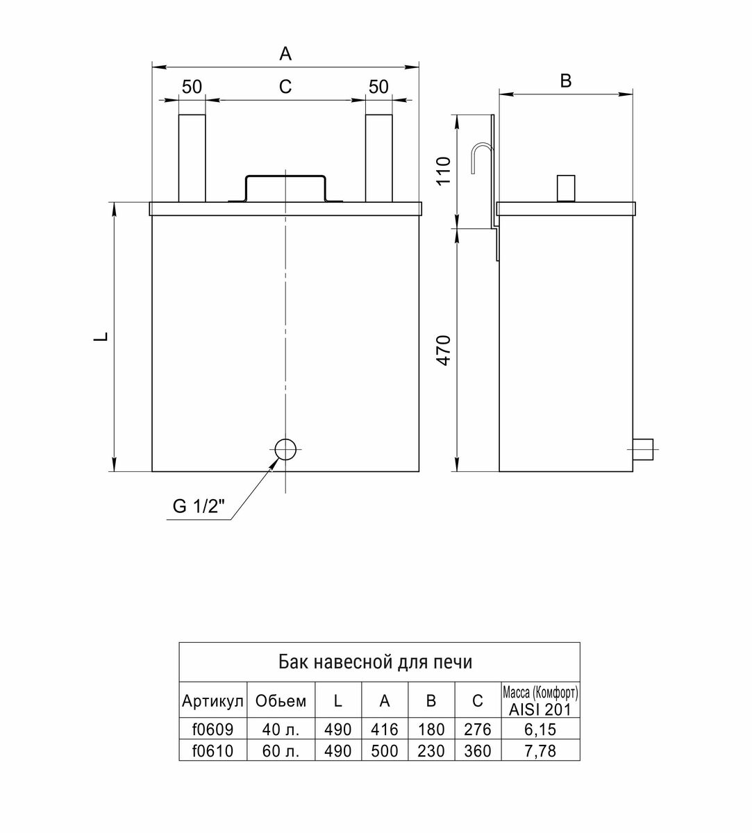 Бак "Комфорт" (AISI 201/1.0) навесной для печи 60л